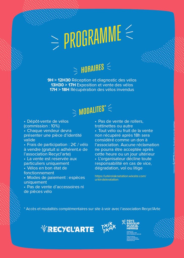 – Frais de participation : 2€/vélo à vendre (gratuit si adhérent.e de Recycl’Arte)